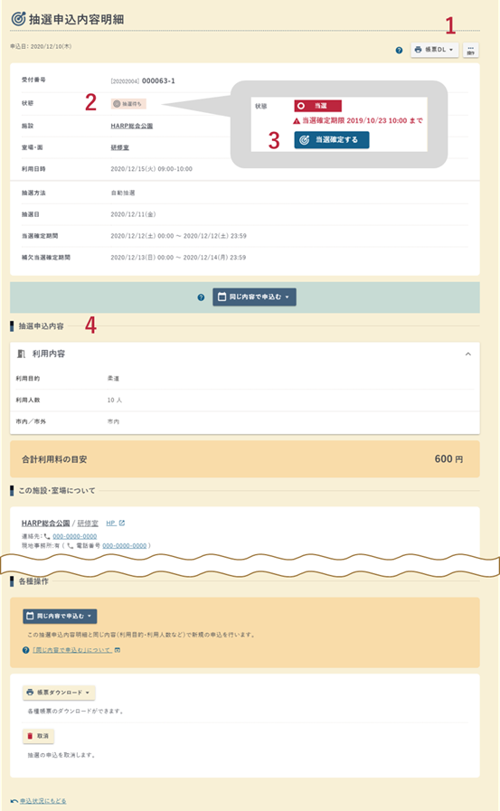 申込済みの抽選申込の詳細の確認が行えます。