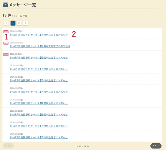 ヘルプ - メッセージ メッセージ 受信メールを確認できます。 NEWマーク 新着のメッセージに表示されます。 メッセージ件名 クリックするとメッセージ内容画面に遷移します。 メッセージ内容 メッセージ内容を表示します。