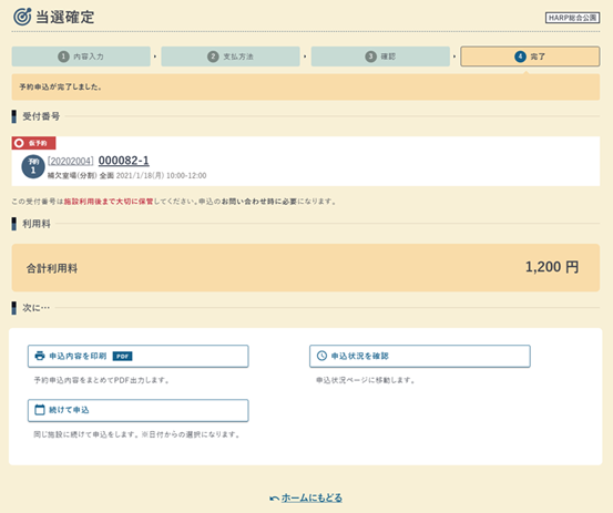 抽選申込が予約申込に切り替わりました。 申込した予約の詳細は、申込状況に新しく作成された予約申込内容明細からご確認いただけます。